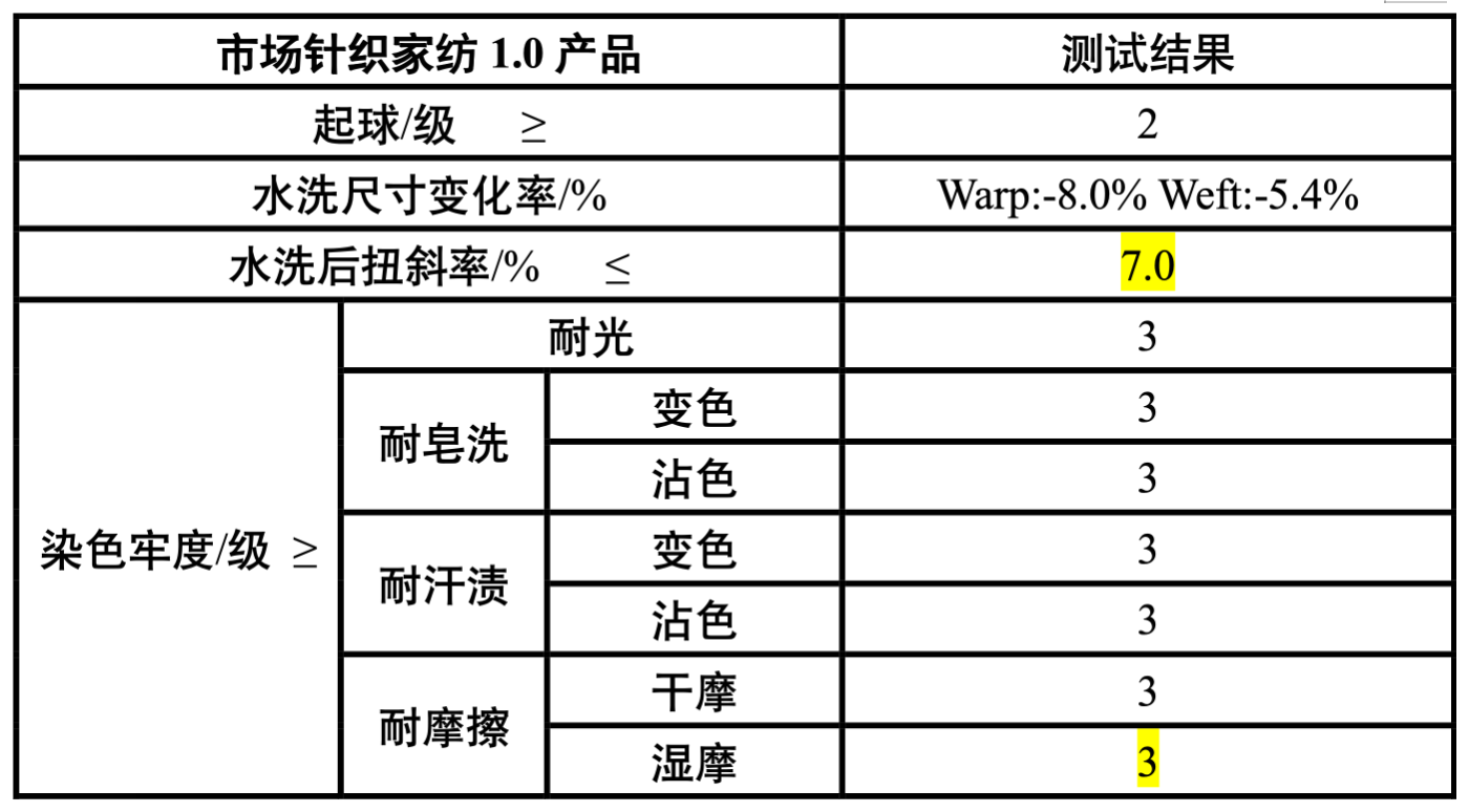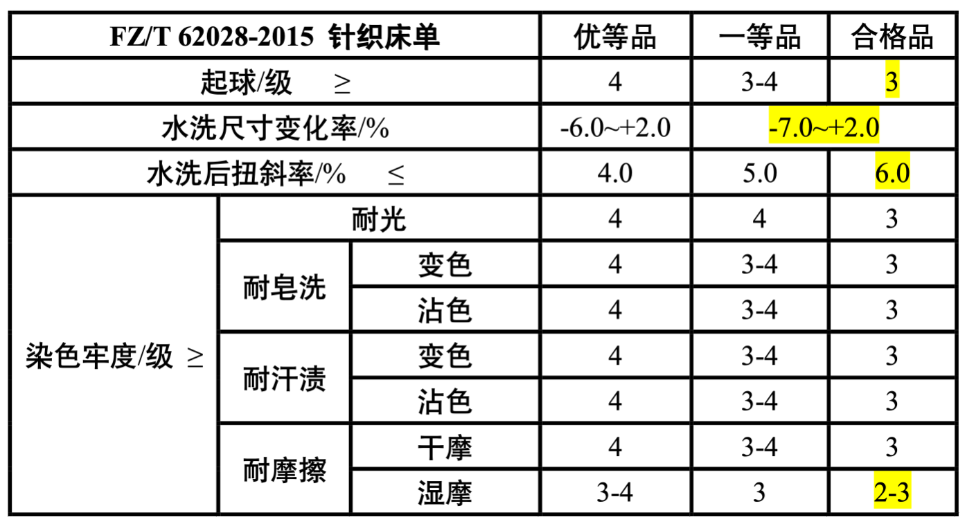 從上表可以看出,市場上現(xiàn)有針織家紡產(chǎn)品的抗起毛起球性能,以及水洗尺寸變化率、水洗后扭斜率,均低于FZ/T 62028-2015《針織床單》要求的合格品標(biāo)準(zhǔn),染色牢度也只是僅僅滿足合格品標(biāo)準(zhǔn)。